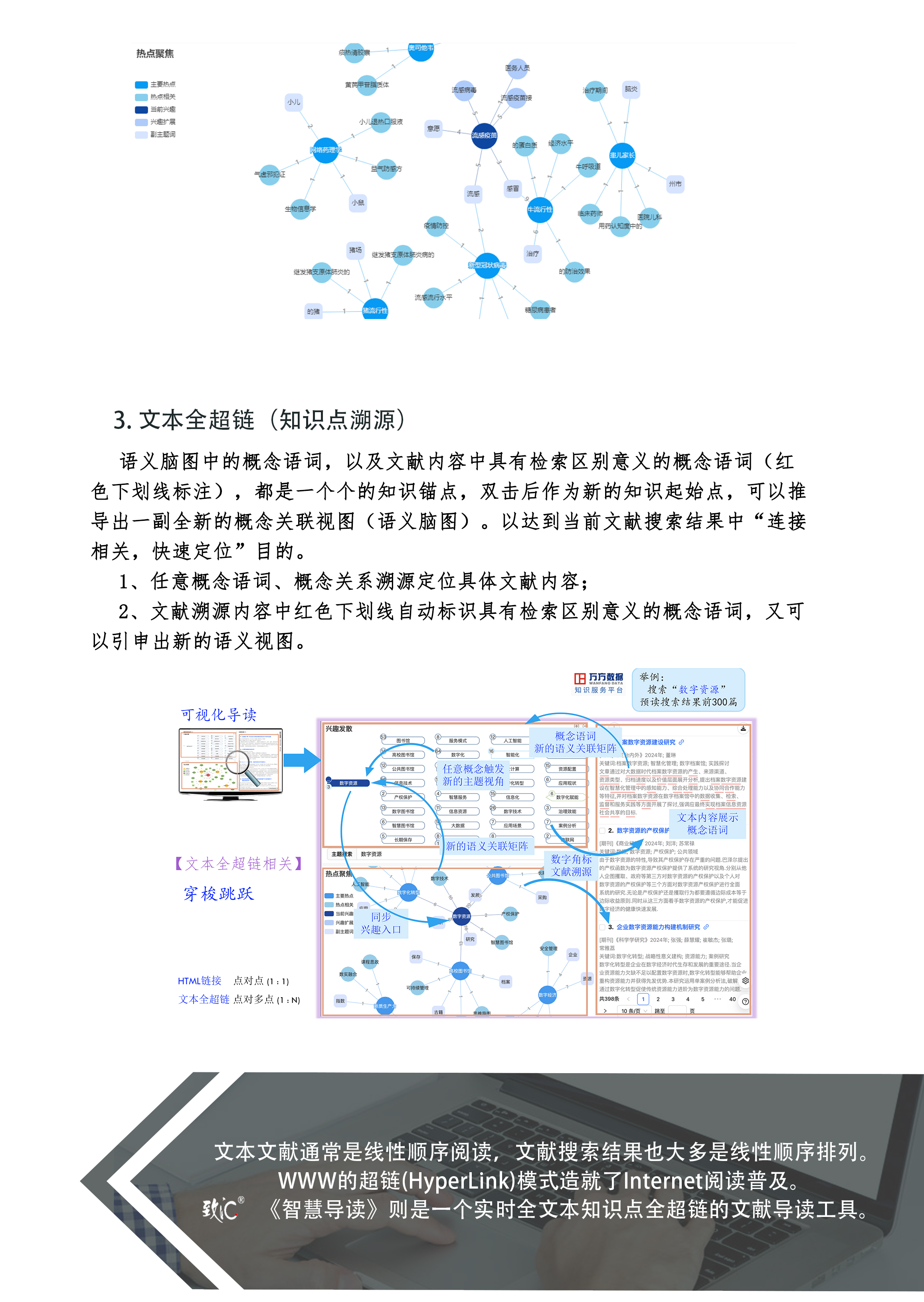 公司产品智慧导读《智慧导读》功能既可以实时无缝嵌入图书馆现有的文献数据库,也可以通过个人积累文献加载方式,围绕读者需求(搜索提问、兴趣点)提供文献内容的可视化语义脑图交互,既能辅助读者启发式发散思维,又能节省读者阅读时间成本。由此,赋予读者文献阅读一种全新的智慧导读体验。试用链接:https://app.metaxyz.com.cn/数字图书馆增值服务 通过文献服务网关技术,为读者提供Façade模式的一站式搜索;提供实时的知识关联分析;提供远程访问和移动阅读;提供读者个性化阅读和文献推荐;提供精准的文献利用统计分析等多种模块化服务功能。 智慧导读 下载智慧导读手册(PDF)